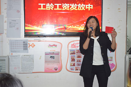 接下來就是我們行政經(jīng)理宣讀工齡工資制度,并發(fā)紅包的環(huán)節(jié)了。每位家人都是笑容滿面上臺(tái)領(lǐng)取著屬于自己的紅包。